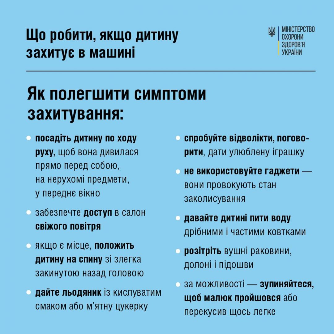 - посадіть дитину в напрямку руху, щоби вона дивилася перед собою на нерухомі предмети чи в переднє вікно;