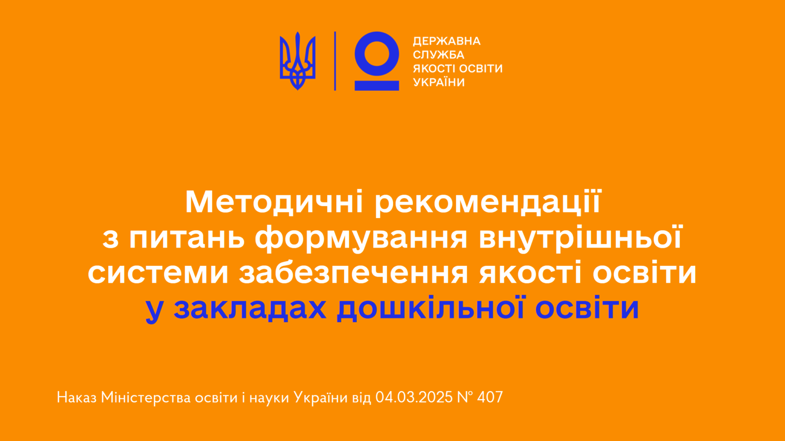 Міністерство освіти і науки України затвердило Методичні рекомендації з питань формування внутрішньої системи забезпечення якості освіти у закладах дошкільної освіти (наказ від 04.03.2025 №407).