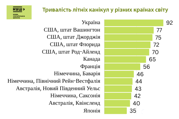 Якщо порівняти тривалість літніх канікул у різних країнах, можна побачити, що в Україні вони чи не найдовші: діти відпочивають все літо (92 дні), а якщо навчання, як доволі часто фактично відбувається, завершується 25 травня, їхня тривалість може досягати 97 днів.