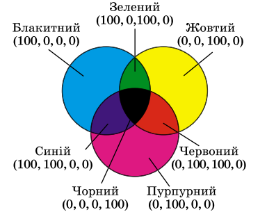 CMYK - модель, яка називається субтрактивна (поглинаюча). Вона використовується в поліграфїї, друкарстві: фарба потрапляє на папір і поглинає частину світла: ми тоді бачимо відповідний колір. Це модель називається CMYK (Cyan-Magenta-Yellow-Black - блакитний-пурпурний-жовтий-чорний).