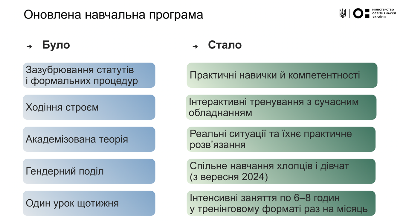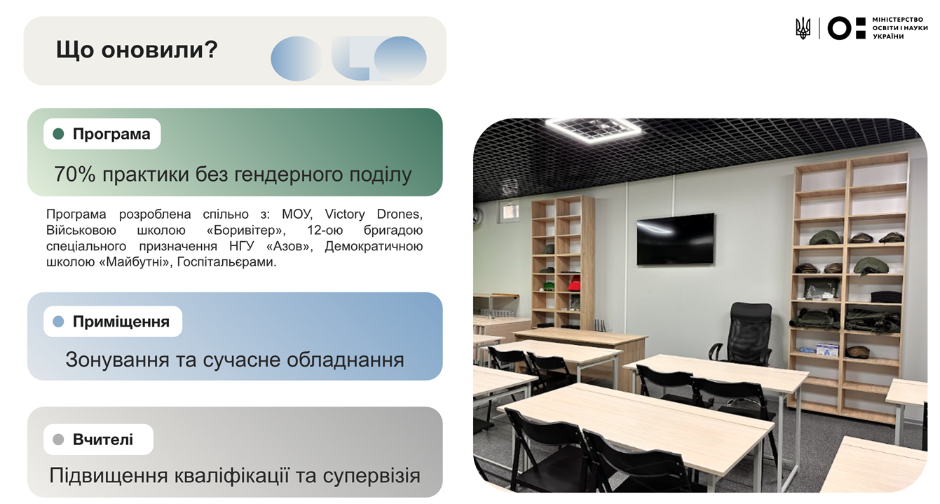 Новою програмою передбачена перепідготовка викладачів, залучення ветеранів російсько-української війни, а також - реконструкція навчального простору.