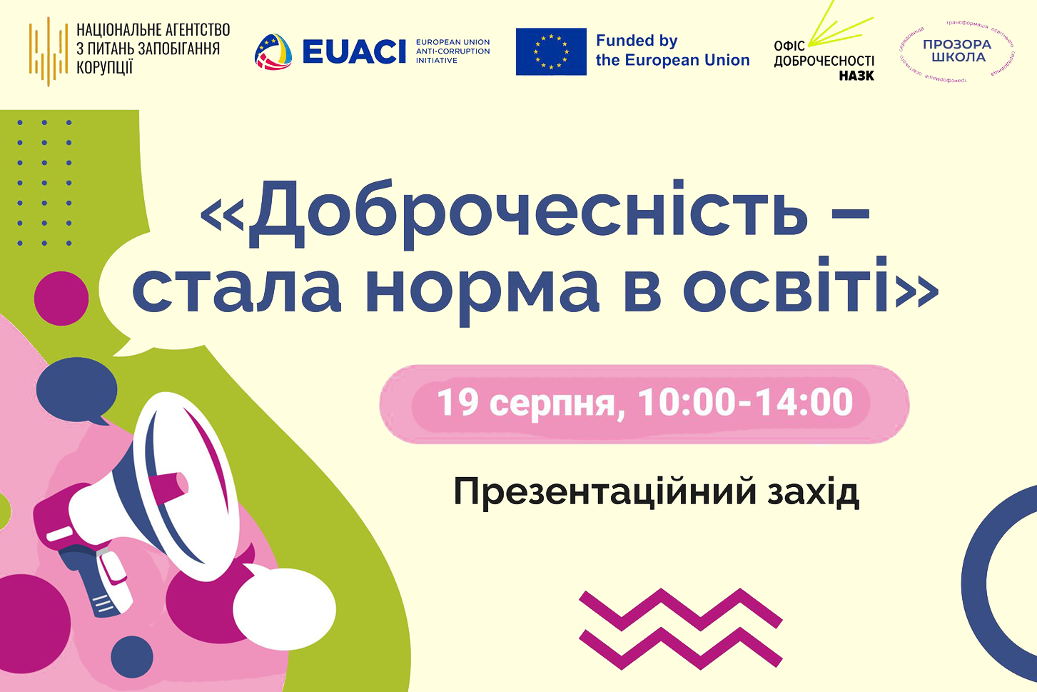 19 серпня 2025 року у Національному агентстві з питань запобігання корупції будуть презентовані освітні продукти Офісу доброчесності НАЗК. Презентація відбудеться в межах заходу “Доброчесність — стала норма в освіті”, на якому учасники разом шукатимуть відповіді на запитання: