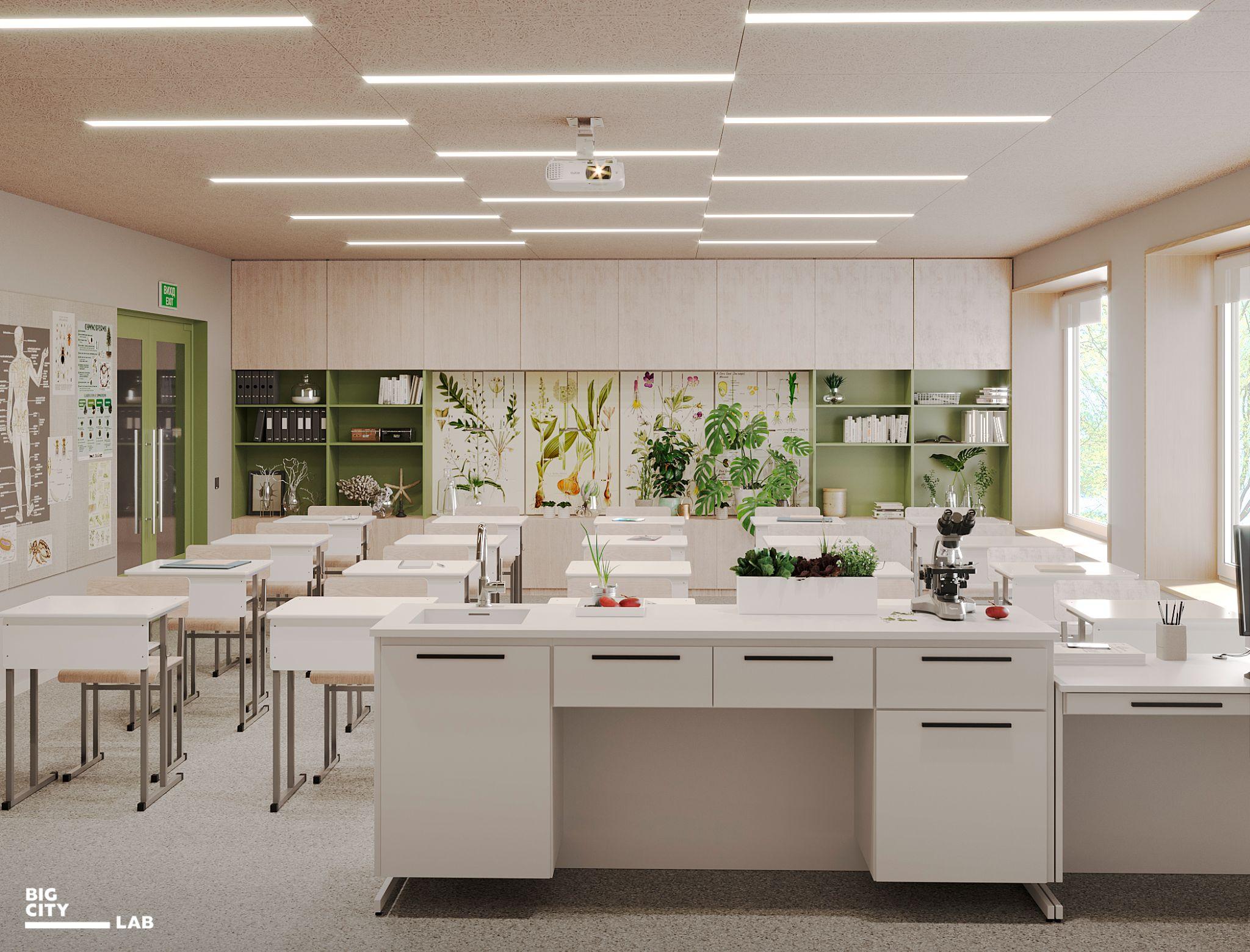 Кольори класів та лабораторій природничих наук — бірюзовий, мʼятний, небесно-блакитний та глибоко фіолетовий. Саме ці відтінки формують відчуття звʼязку з природою, середовищем та наукою.