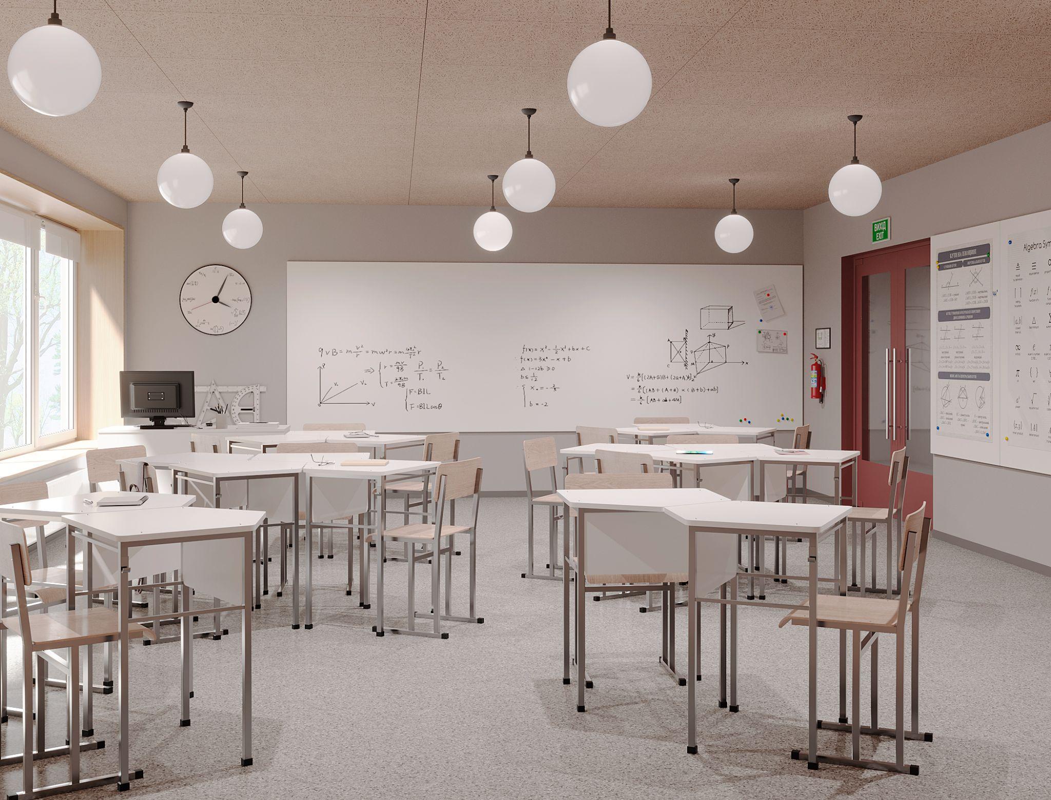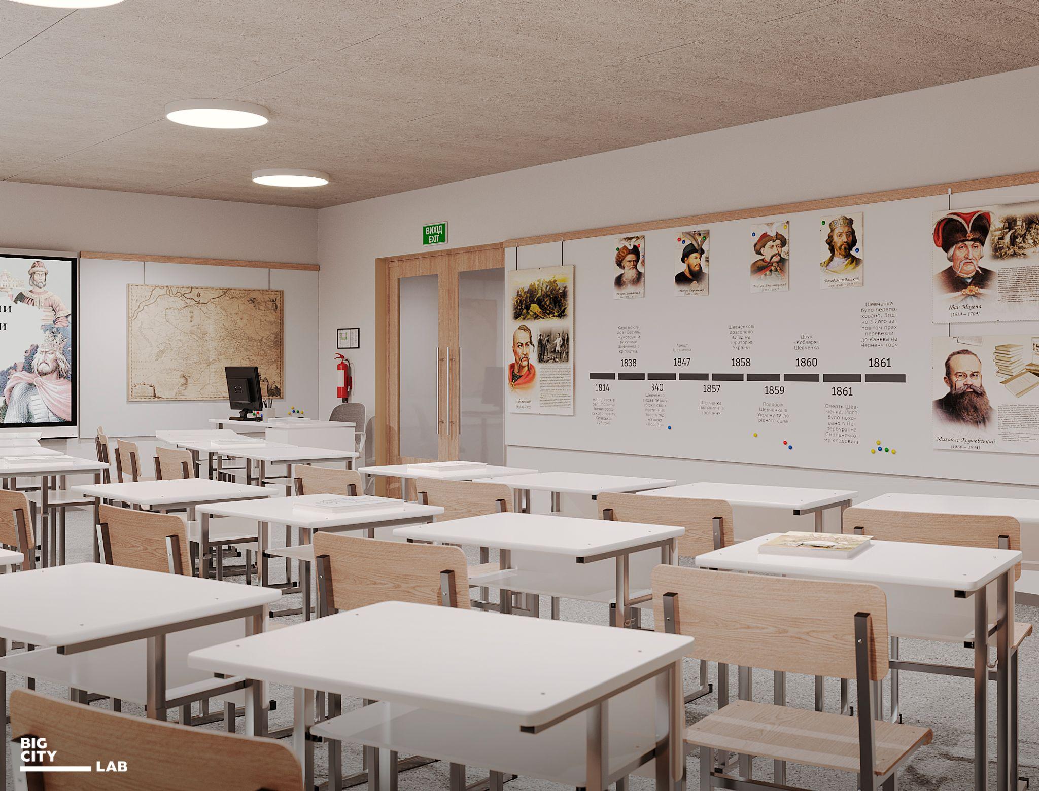 Для теоретичних навчальних кабінетів обрали світлі нейтральні кольори — теплий білий, пісочний, оливковий, світле дерево. Бо це класи щоденної навчальної практики, тому простір має бути спокійним і нейтральним, не домінувати, а підтримувати концентрацію.