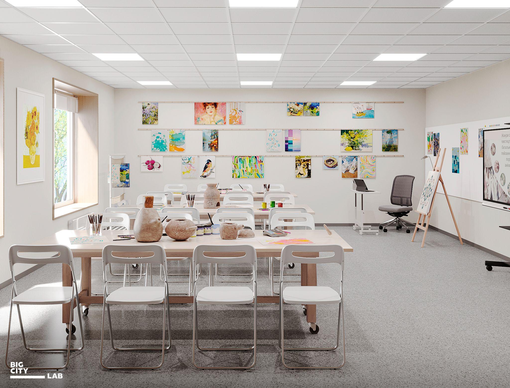Для кабінетів мистецької галузі — білий, теплий бежевий, айворі, світле дерево. Так на передній план зможе вийти творчість дітей.