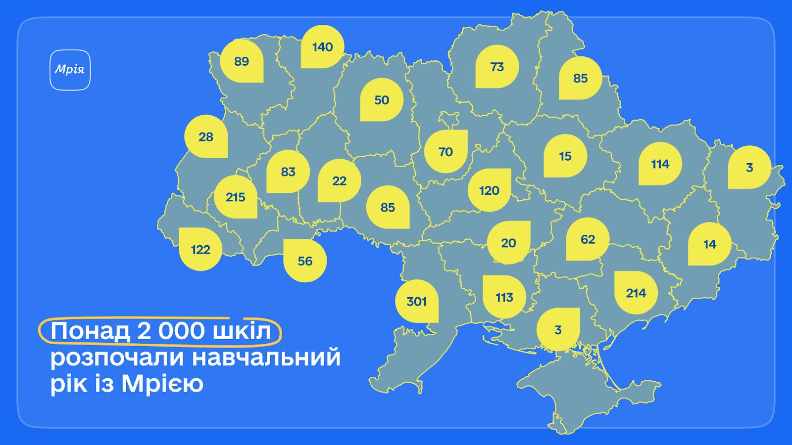 Понад 2 000 шкіл з усіх 24 областей України долучилися до освітньої екосистеми “Мрія”, яка відтепер доступна кожній охочій школі. Це перший навчальний рік, коли цифровий сервіс впроваджується на загальнонаціональному рівні — від Закарпаття до Донеччини, від Сумщини до Херсонщини.