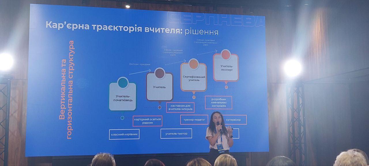 На Серпневій педагогічній конференції нову модель кар’єрного зростання презентувала учасниця робочої групи МОН, завідувачка кафедри педагогіки, психології та теорії управління освітою “Інституту післядипломної педагогічної освіти Чернівецької області”, кандидат педагогічних наук Ірина Унгурян.