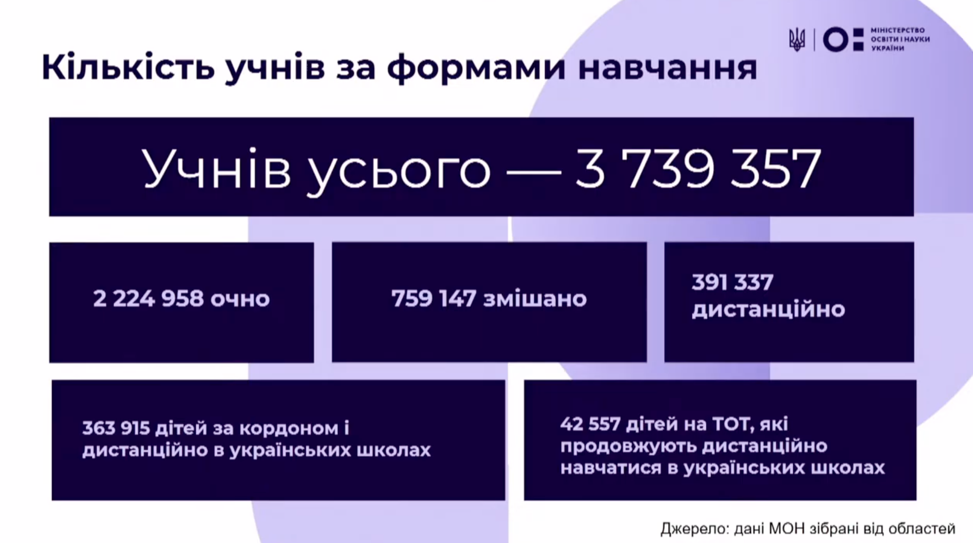 На початок 2024/2025 навчального року в Україні працювало 12 248 шкіл. Формати навчання виглядали так: близько 7 800 закладів працювали офлайн, 2 000 — повністю дистанційно, ще приблизно 2 400 — у змішаному форматі.
