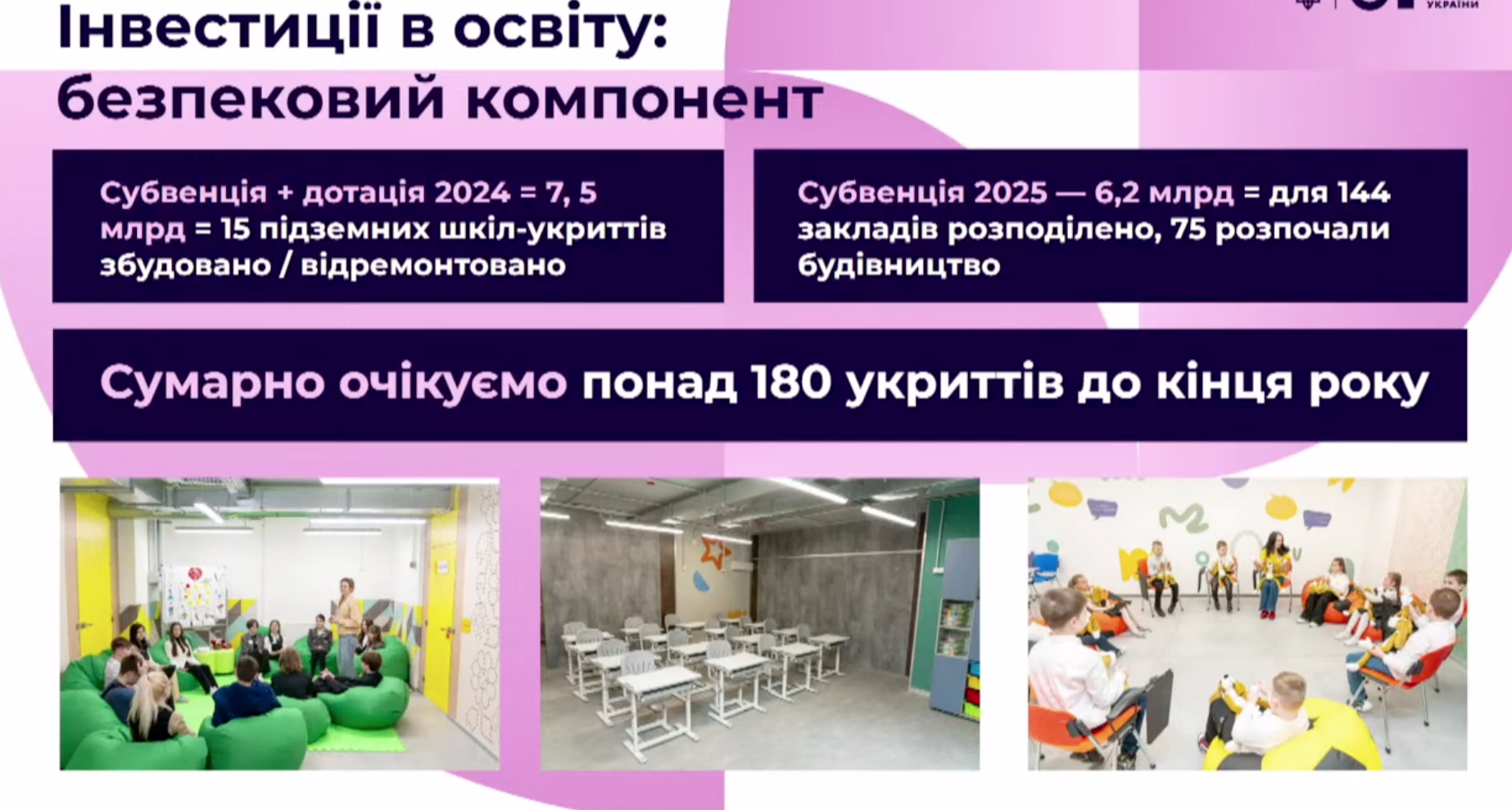Тим не менш, під час прес-брифінгу Міносвіти у червні заступниця міністра освіти Надія Кузьмичова озвучила цифру у 144 закладів освіти, які вже отримали субвенцію у 6,2 млрд грн для будівництва укриттів, з них 75 – на той момент вже розпочали будівництво. “До кінця цього календарного року ми очікуємо введення в експлуатацію близько 180 укриттів”, — зазначила Надія Кузьмичова. При цьому додала, що державна субвенція йде на капітальне будівництво, а найпростіші укриття фінансуються з місцевого бюджету, оскільки не належать до об’єктів цивільного захисту в умовно безпечних регіонах.