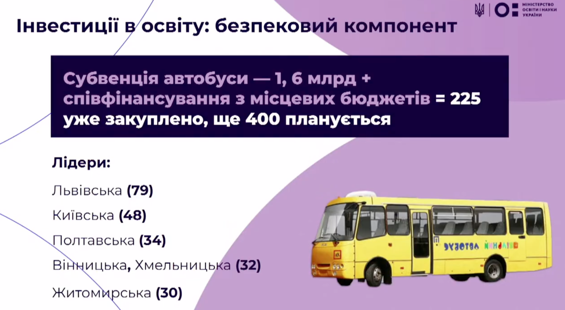 Як зазначила під час брифінгу Надія Кузьмичова, завдяки освітній субвенції у 1,6 млрд грн та співфінансування місцевих бюджетів вдалося закупити 225 автобусів. Ще 400 планували закупити протягом цього року. Лідерами по кількості автотранспорту для підвезення вчителів і учнів стали Львівська, Київська і Полтавська області.