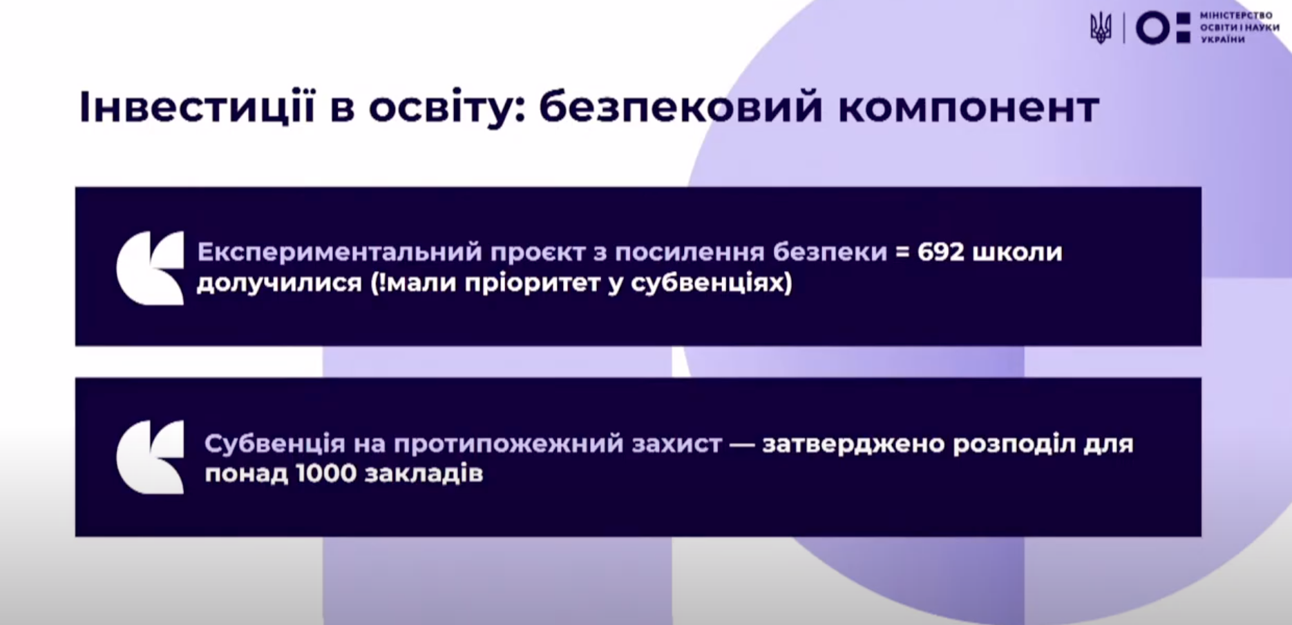 У листопаді минулого року Кабінет Міністрів України оприлюднив постанову про запровадження експериментального проєкту щодо посилення безпеки у закладах освіти. В першу чергу йшлося про протипожежну безпеку. В проєкті взяли участь 692 школи, а згодом держава виділила субвенцію для понад 1000 закладів освіти, щоб посилити протипожежні заходи. За попереднім планом уряду, у 2025/2026 навчальному році до проєкту зможуть доєднатися до 3000 закладів освіти.