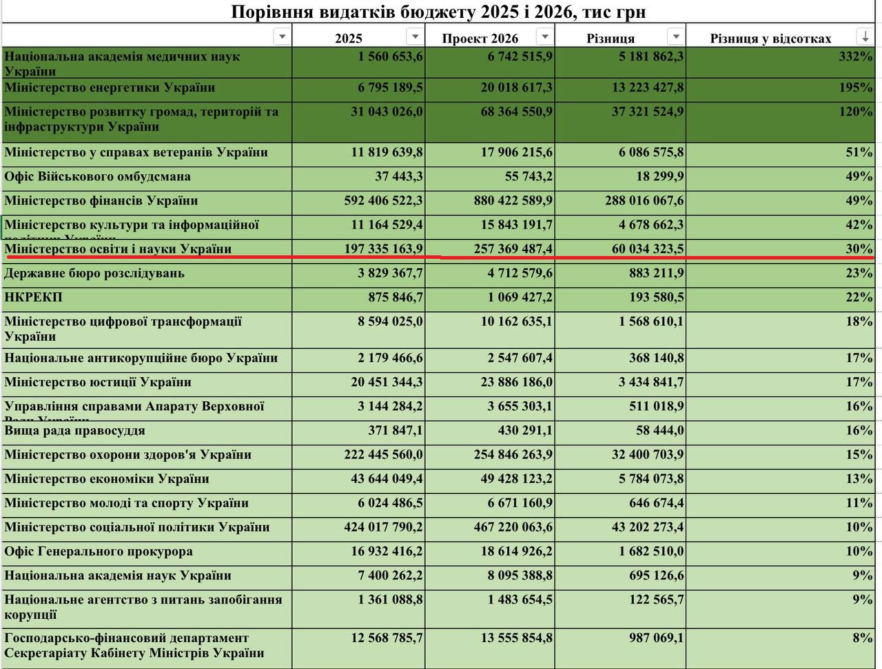 Що стосується фінансування освіти, то цього року в проєкті Бюджету на 2026 рік уряд заклав збільшення видатків у розмірі 30,4%.