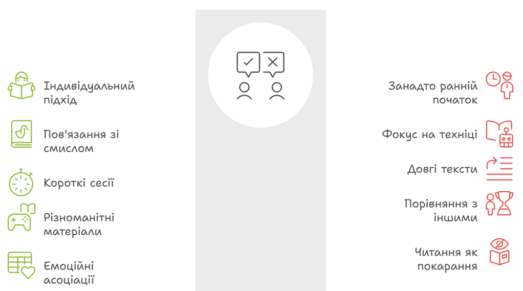 “Не підеш гуляти, поки не прочитаєш”. Читання має асоціюватися з радістю, грою, відкриттям.