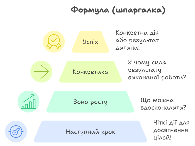 Для дітей дуже корисно вчитися аналізувати власні успіхи: “Що я можу вже зараз? Що ще потрібно зробити? Які дії допоможуть досягти результату?”. Це формує навички самооцінювання, відповідальність та впевненість у своїх силах.