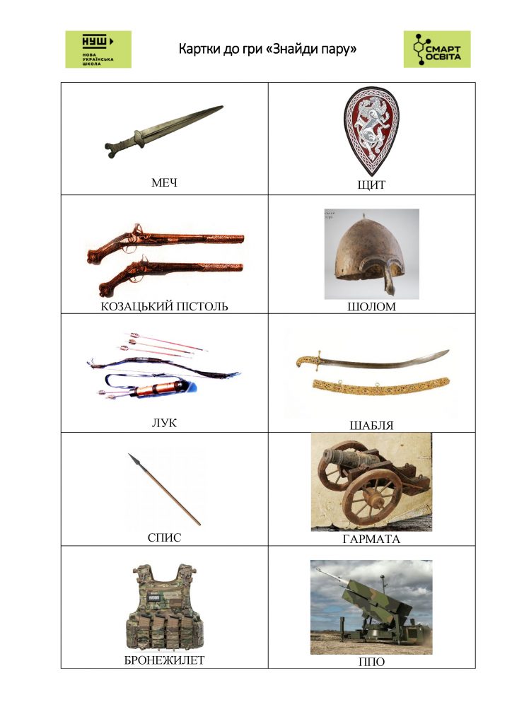 - Я зараз роздам вам картки, на яких написана назва зброї або захисних обладунків воїнів різних історичних епох України. І є відповідне зображення. З кожною назвою є по дві (або три – якщо група більше 20 осіб) картки. Отже, якщо вам дістанеться картка, на якій буде написано “меч”, знайте, що в когось іншого теж є картка з написом “меч”.