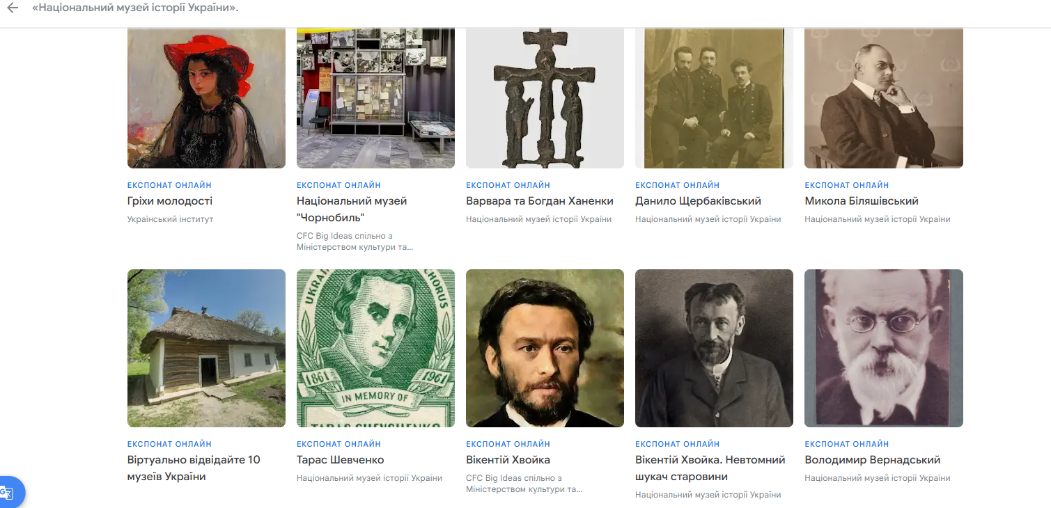 Google Arts & Culture (безкоштовний додаток і сайт: artsandculture.google.com) – пропонує доступ до тисяч музейних колекцій, віртуальних турів музеями світу та пам’ятками архітектури, включаючи українські (Національний музей мистецтв імені Богдана та Варвари Ханенків, Національний художній музей України, Музей Голодомору).