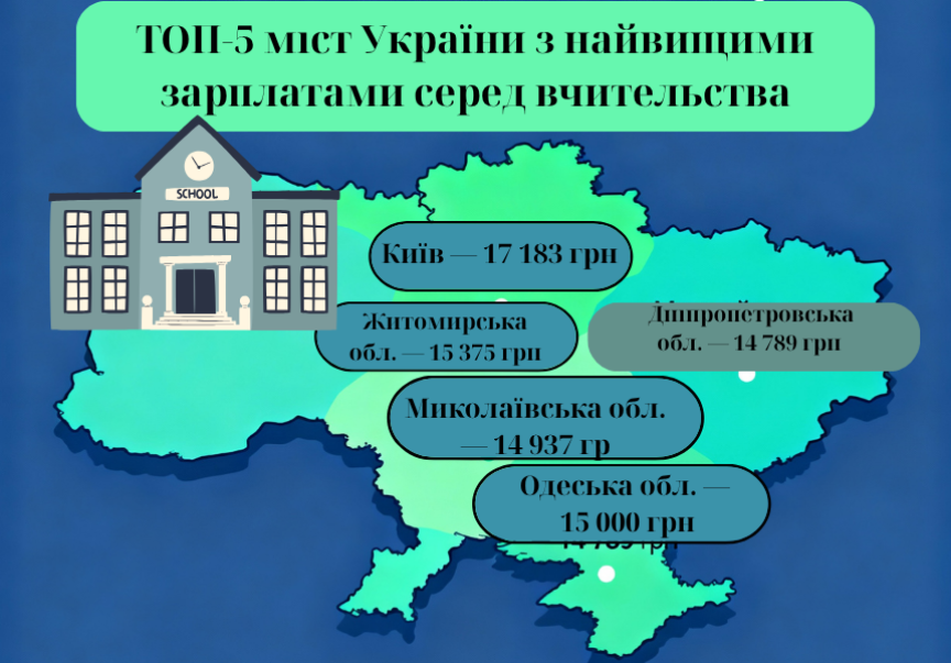У містах понад 100 тисяч мешканців учителі заробляють у середньому 15 374 грн, у селах — 12 801 грн. Різниця — майже 2 600 грн.
