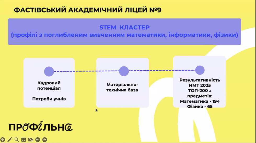Першим своїм практичним досвідом поділився Фастівський академічний ліцей №9 (Київська обл.), який входить до числа пілотних закладів-“амбасадорів” реформи. Фастівський ліцей обрав STEM-кластер профілів – з поглибленим вивченням математики, інформатики та фізики.