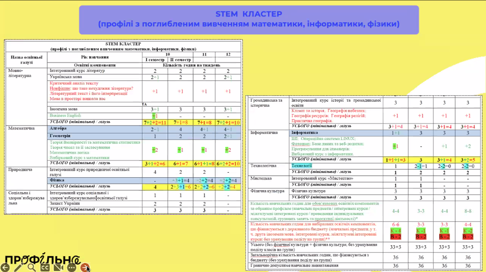 На початку вебінару експерти Міністерства освіти детально розповіли про структуру типової освітньої програми та навчального плану для профільного трирічного ліцею (10–12 класи). Базовий навчальний план – додаток до Державного стандарту профільної середньої освіти – визначає, скільки годин відводиться на кожну освітню галузь у 10-му, 11-му і 12-му класах. З цього плану видно, що частину предметів учні вивчатимуть протягом усіх трьох років, а частину – лише на першому чи другому році, якщо ці галузі не є профільними для обраного напряму.