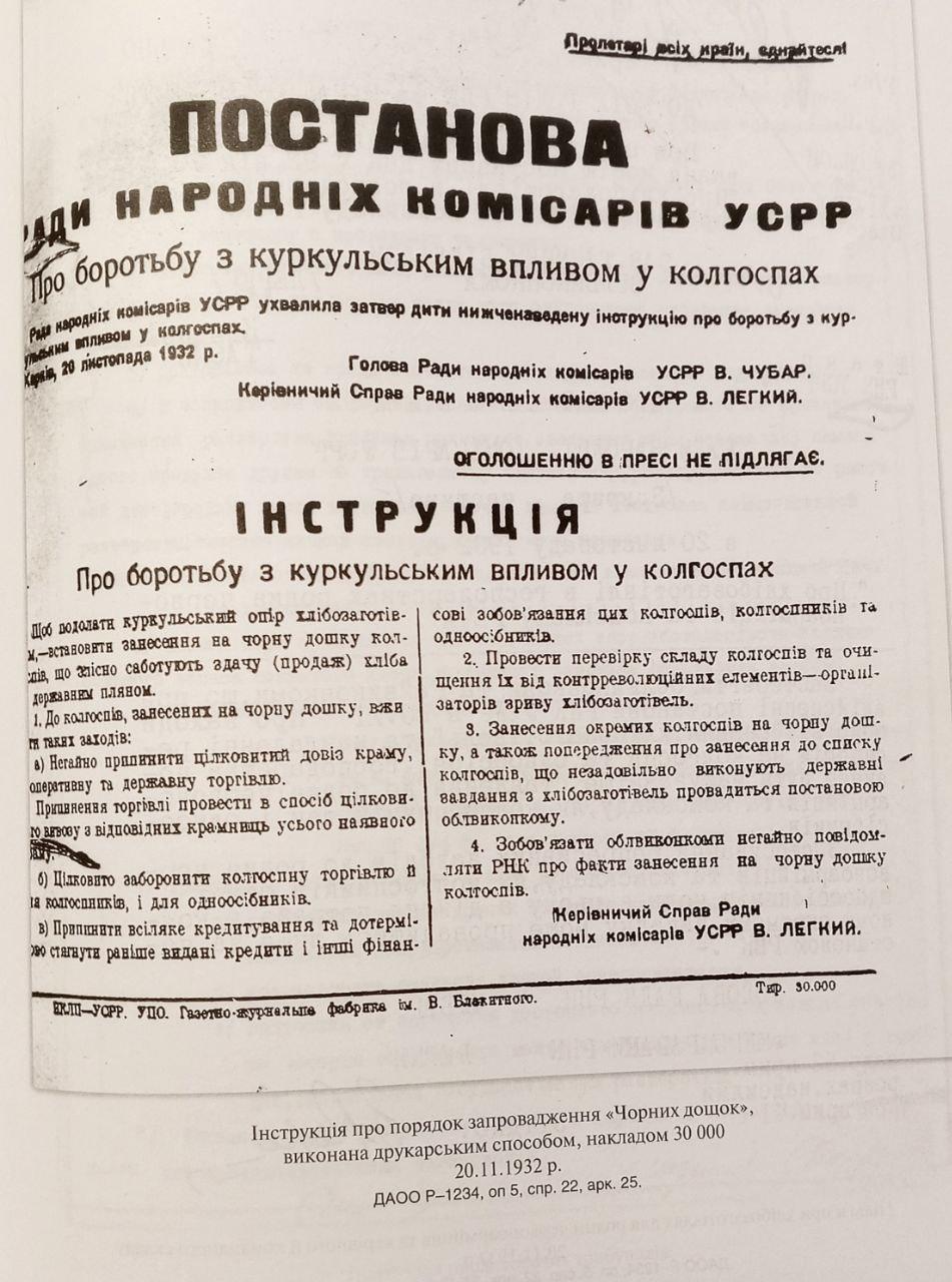 Однак лише проти України і Північного Кавказу - Кубані (де на той час компактно проживали українці і мали свої школи, ГО та часописи) було влаштовано геноцид. Людей цілеспрямовано ізолювали від їжі. А ті населені пункти, які найбільше опиралися радянській владі, записували на “чорні дошки”. Це означало, що їх брали в блокади, а в людей забирали не лише продукти і одяг, але й насіння овочів.