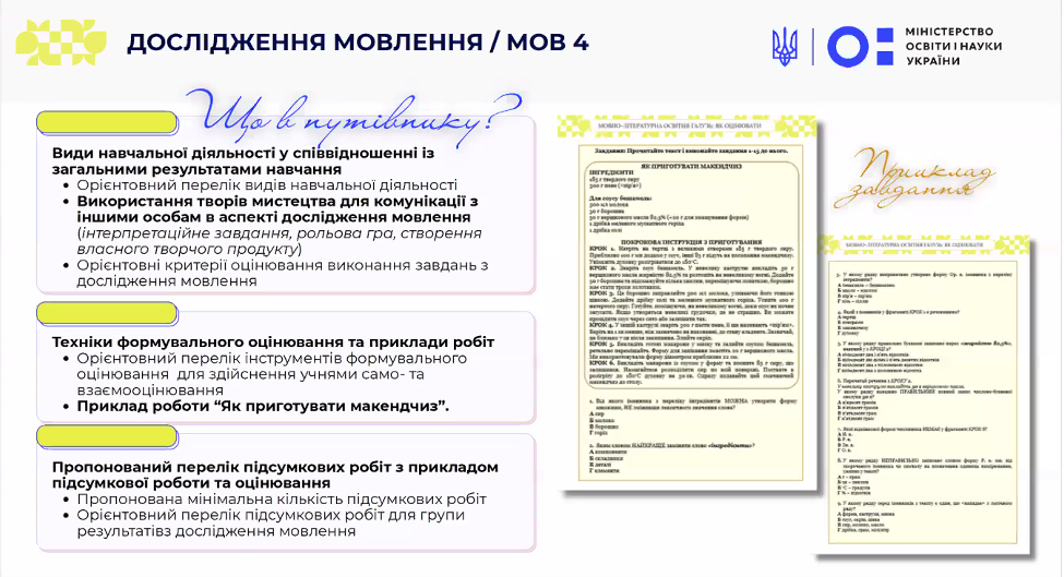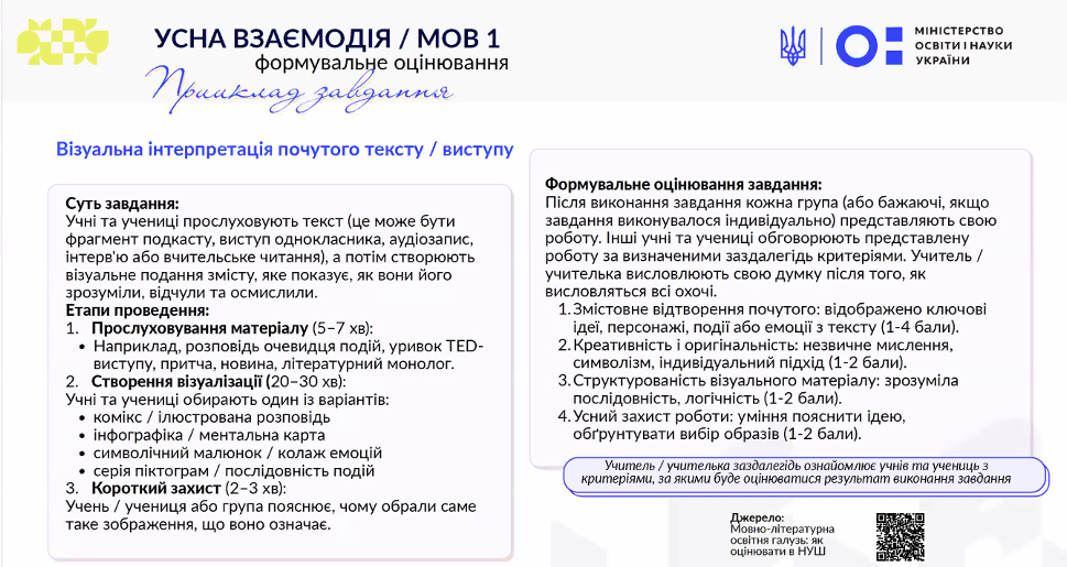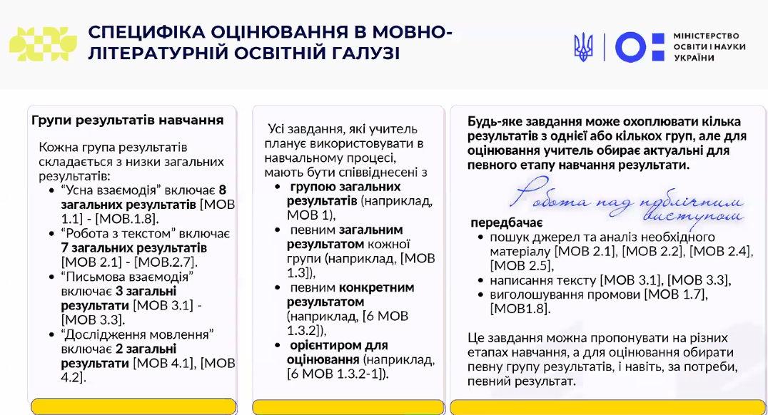 Спікерка пояснила, що сумніви абсолютно природні. Адже мовно-літературна галузь — одна з найбільших у шкільному розкладі, а обсяг видів діяльності — від аудіювання до творів, від роботи з інфографікою до стилістичного аналізу — надзвичайно широкий. Щоб упорядкувати цю багатовимірну роботу, і був створений новий 120-сторінковий методичний посібник “Як оцінювати в НУШ”.