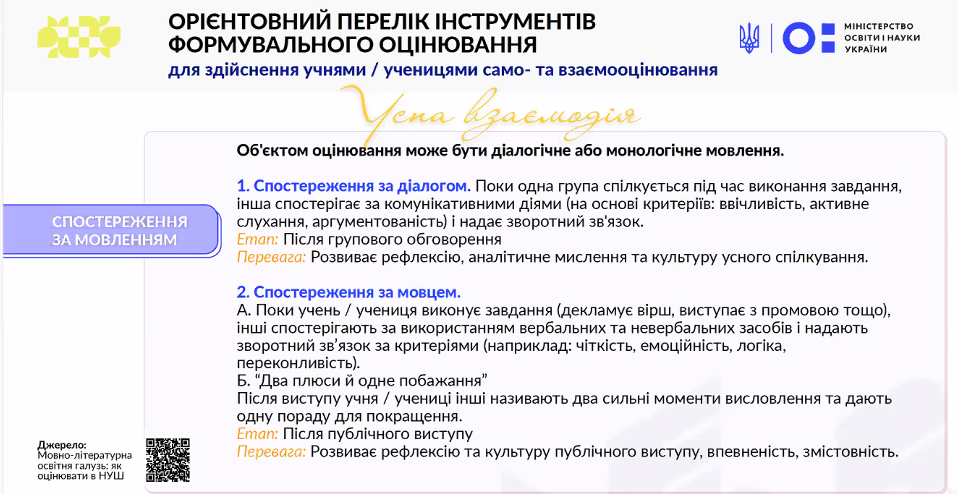 Усна взаємодія — це не просто “відповів — отримав бал”. Вона охоплює слухання, аудіювання, монологічне та діалогічне мовлення, інсценізації, дискусії, роботу в парах і групах.