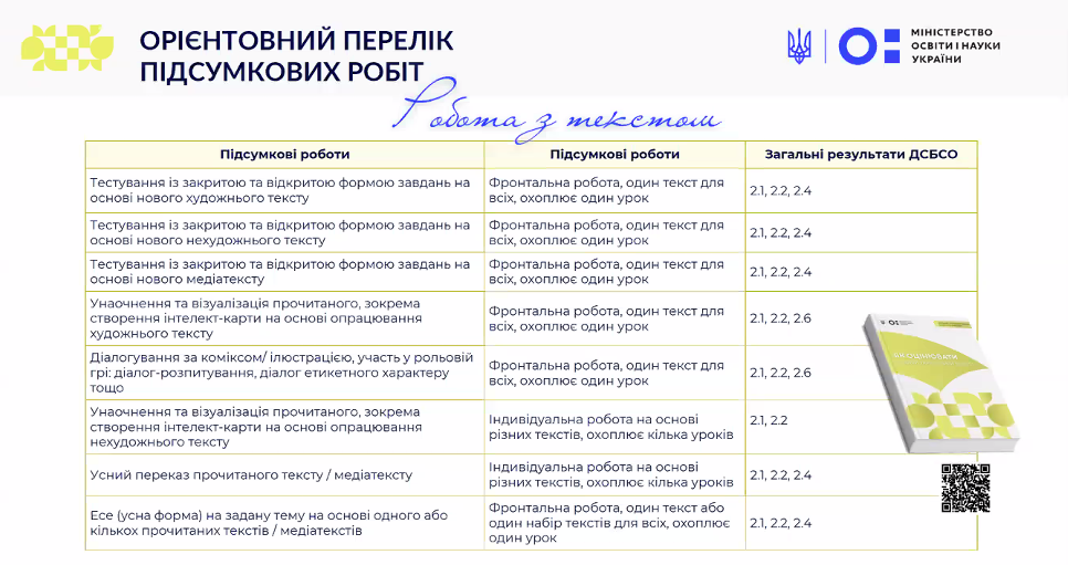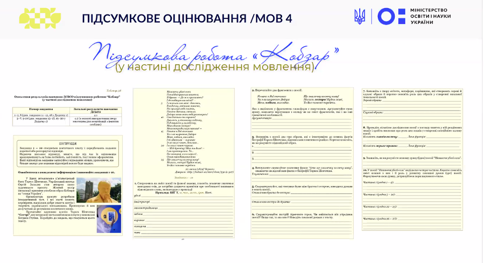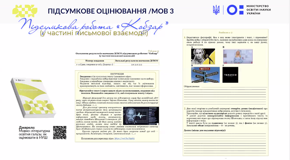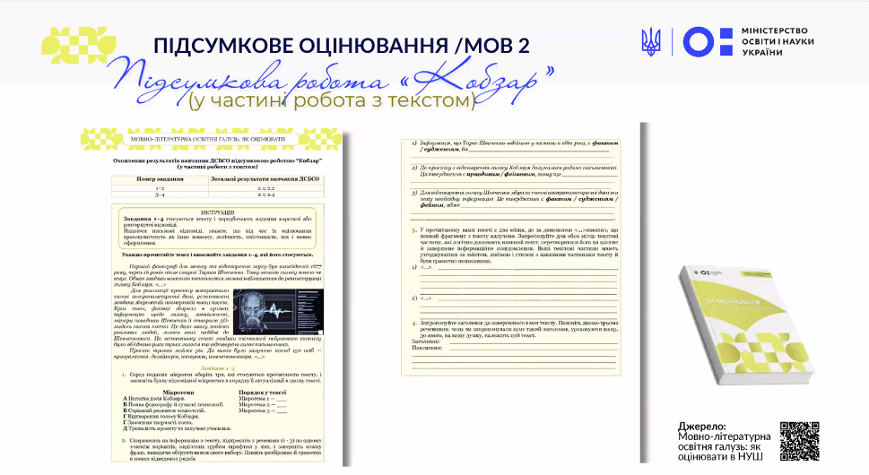 У вебінарі ця частина стала демонстрацією того, як виглядає підсумкове оцінювання, побудоване не на випадковому наборі вправ, а на чіткій логіці груп результатів. Саме тому в методичному посібнику половину розділу присвячено розбору однієї комплексної роботи — тій, що отримала умовну назву “Кобзар”.