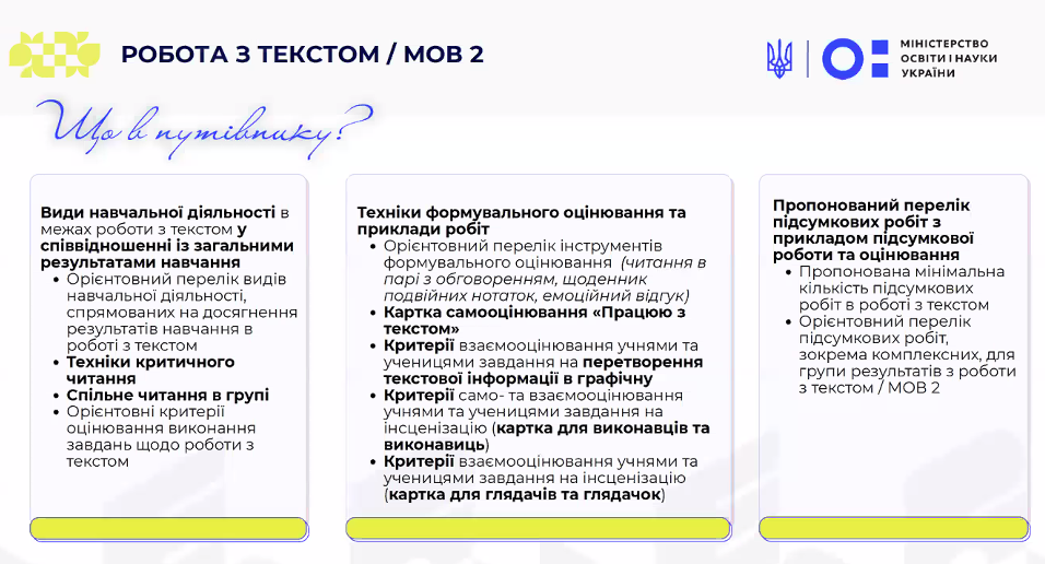 Співавторка посібника “Мовно-літературна освітня галузь: як оцінювати в НУШ”, учителька української мови та літератури, Людмила Лінкевич додала практичний інструмент. Учні працюють у парах: один читає текст вголос, інший — ставить три запитання за змістом і фіксує основну думку. Потім діти міняються ролями.
