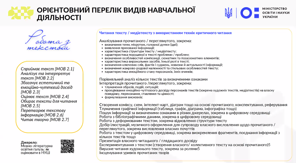 У другій групі результатів — роботі з текстом — вчитель фактично стає провідником у процесі осмислення. Тут важливо не те, чи може дитина переказати оповідання “від коми до коми”, а те, наскільки вона здатна побачити структуру тексту, зрозуміти логіку автора, відрізнити факт від оцінки, а інформацію — від маніпуляції. Саме тому посібник пропонує працювати з різними типами текстів — художніми, медійними, інформаційними — як із матеріалом для аналізу, а не просто перевірки.