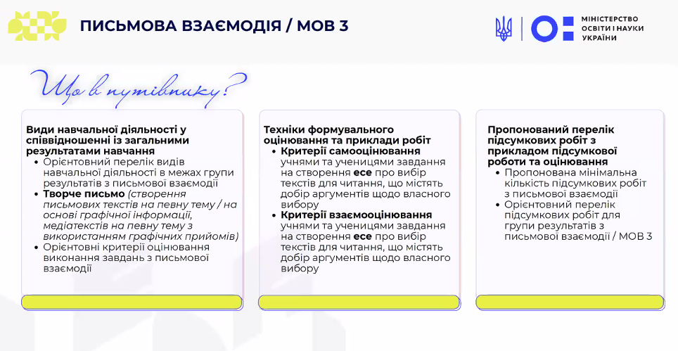 У третій групі результатів — письмовій взаємодії — учитель стикається з, мабуть, найбільш тонкою частиною мовно-літературної освіти. Адже письмо — це не лише техніка й не набір правильно розставлених ком. Це спосіб мислити, осмислювати, переконувати й створювати власний текстовий світ.