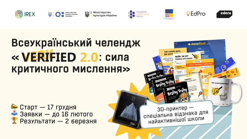 Стартував Всеукраїнський челендж “Very Verified 2.0: сила критичного мислення”, до участі в якому запрошують заклади середньої та професійної (професійно-технічної) освіти. Ініціатива спрямована на розвиток медіаграмотності та критичного мислення серед учнів, студентів, вчителів і представників громад.