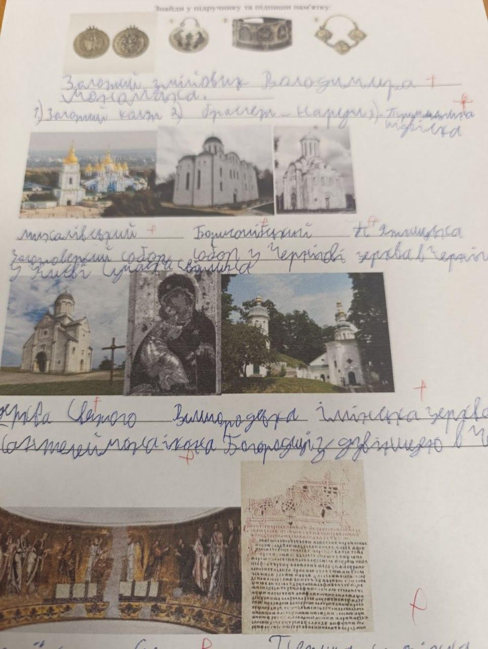 “Наприклад, коли з історії ми вивчали, чим займалося населення України-Руси, я давала ілюстрацію, а учень підписував, що люди роблять на ній, - каже пані Наталя. - У 8 класі, вивчаючи козаків, він підписував на малюнку, яку зброю та одяг мав козак. Коли учили хрестові походи, хлопець намалював хрестоносця: він дуже любить малювати і сприймає інформацію через образи. А цьогоріч вивчали тему “Культура Відродження”, і я дала завдання прочитати інформацію про Леонардо да Вінчі та підписати його винаходи”.