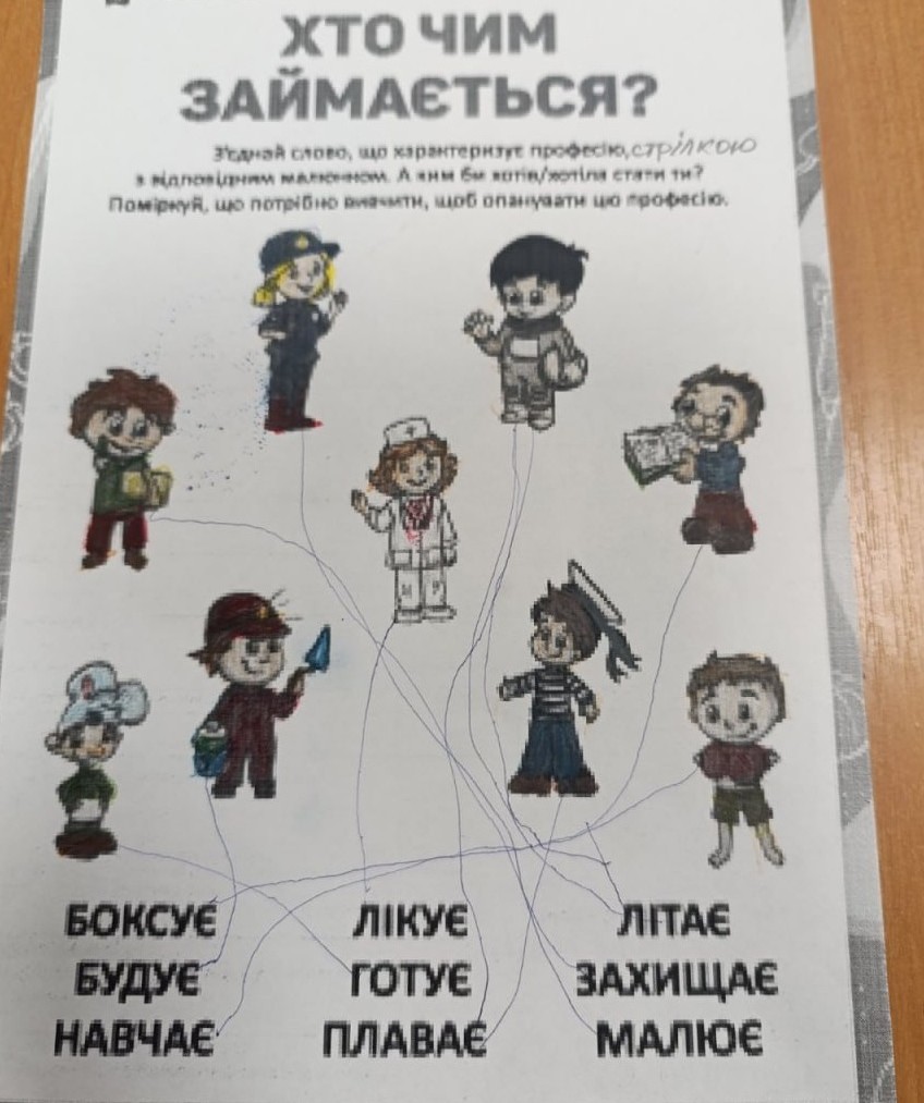 “Я ще викладаю у 8 класі громадянську освіту. Остання тема була “Самореалізація”. Ми говорили про різні професії, а цьому учню я додатково запропонувала таке завдання: з’єднати дієслова і назви професій. Йому було дуже цікаво!” - каже пані Наталя.