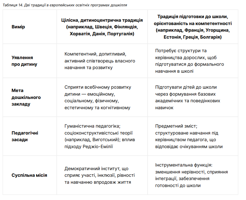 Європейські країни розвивалися двома різними шляхами. Англосаксонська модель — більш “шкільна”, орієнтована на академічні результати й підготовку дітей до формальної освіти. Скандинавська ж бачить дитину як рівноправного учасника навчання і ставить у центр добробут, соціалізацію, гру й дослідження. Зазначається, що “у скандинавсько-центральноєвропейській традиції робиться більший акцент на інтеграції догляду й освіти з ширшими, більш цілісними цілями”.
