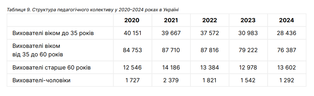 Це особливо помітно у віковій структурі працівників: “значна частка працівників ЗДО перебуває у передпенсійному та пенсійному віці, що вказує на системний ризик майбутнього кадрового дефіциту”. Якщо не змінити мотиваційні та фінансові умови, професія ризикує втратити ціле покоління фахівців, а замінити їх буде дедалі складніше.