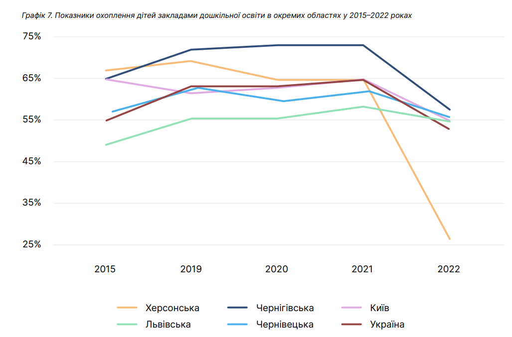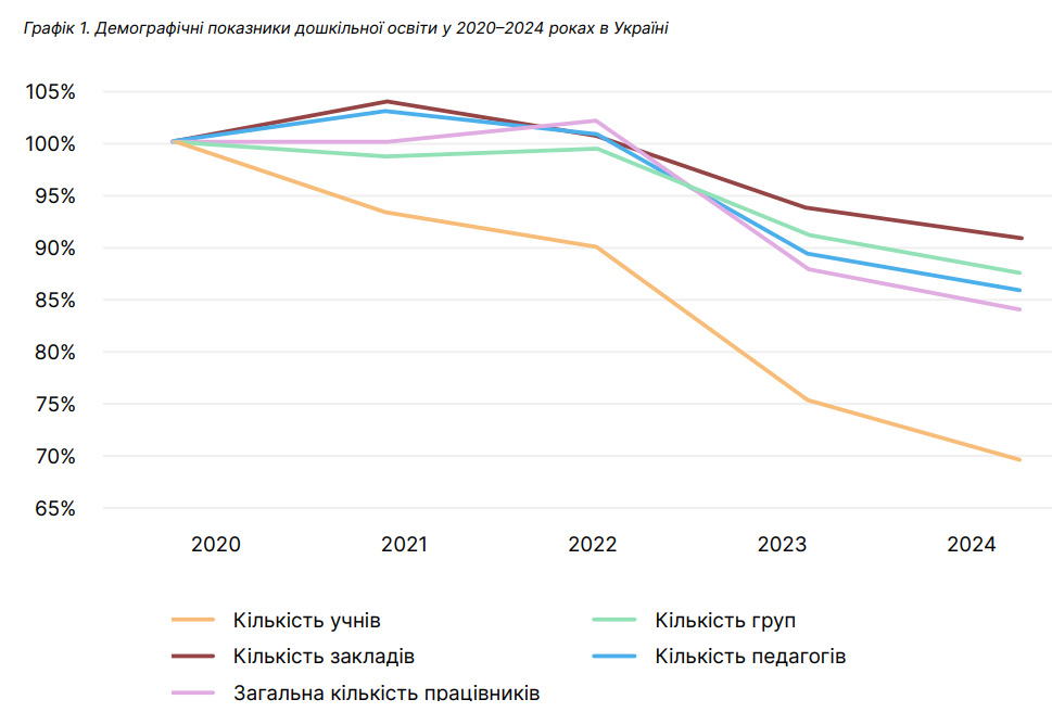 У звіті показано, як за кілька років суттєво скоротилася кількість дітей, які потенційно можуть відвідувати ЗДО, а також як війна посилила ці тренди через вимушену міграцію. Ці дані важливі для розуміння того, чому в одних громадах садки переповнені, а в інших — стоять напівпорожні.