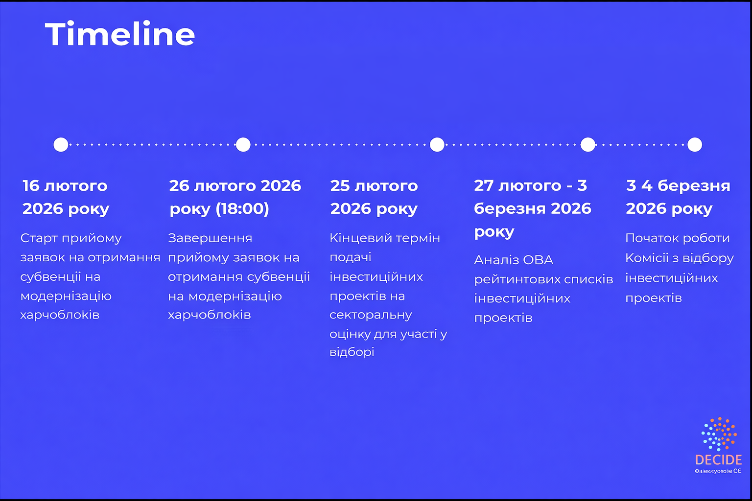 Практичний розбір нових правил надання субвенції, оновлені умови фінансування, вимоги до проєктів, механізм співфінансування та система оцінювання заявок – всі ці актуальні питання були розглянуті на вебінарі “Особливості відбору проєктів з модернізації харчоблоків у 2026 році”, організованому швейцарсько-українським проєктом DECIDE у партнерстві з Міністерством освіти і науки України, командою реформи шкільного харчування та Антикорупційною ініціативою ЄС. Команда медіа НУШ підготувала практичні рекомендації для освітніх управлінців по матеріалах вебінару.