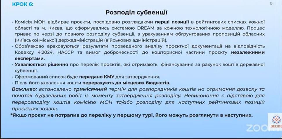 У 2026 році ключові зміни були внесені постановою від 11 лютого 2026 року №188 “Про внесення змін до Порядку та умов надання субвенції з державного бюджету місцевим бюджетам на реалізацію публічного інвестиційного проекту на придбання обладнання, створення та модернізацію (проведення реконструкції та капітального ремонту) їдалень (харчоблоків) закладів освіти, зокрема військових (військово-морських, військово-спортивних) ліцеїв, ліцеїв із посиленою військово-фізичною підготовкою”. Саме цей документ, за словами спікерки, громади часто ігнорують, подаючи заявки “за старою пам’яттю”.