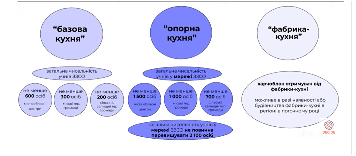 “Якщо малокомплектний заклад, його можна включити в мережу, де можна створити опорний харчоблок та доставляти готову гарячу продукцію”.