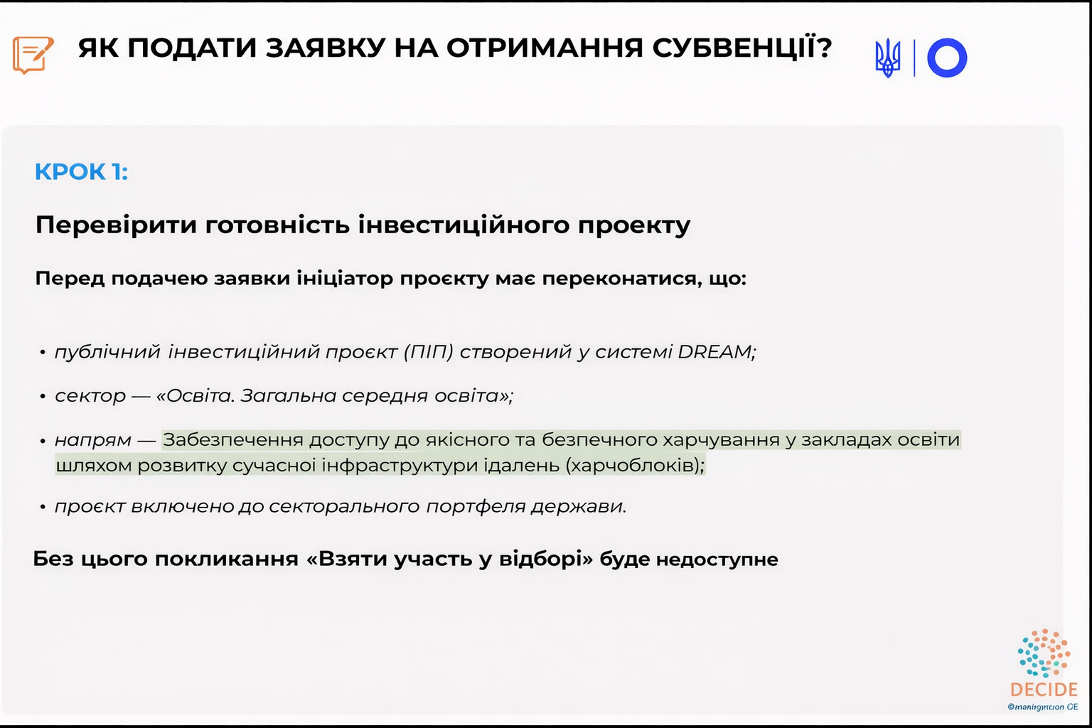 Це означає, що окремі “точкові” рішення — наприклад, заміна одного виду обладнання без зміни технології та приміщень — не відповідають логіці субвенції. Проєкт має показувати, як змінюється вся система харчування, а не окремий її елемент.