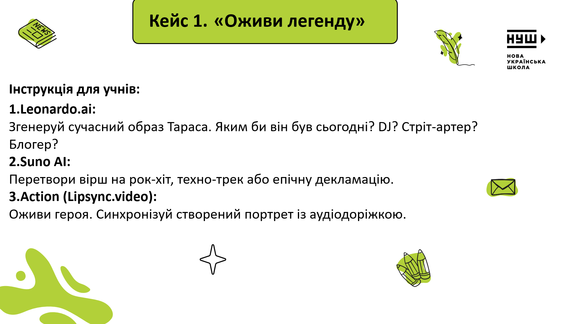 Можна запропонувати учням створити контент, натхненний кейсами відомих медіапроєктів, як-от Sense Ministry (відомий за образом DJ Шевченка). Це проєкт, де класика перетворюється на сучасне цифрове мистецтво.