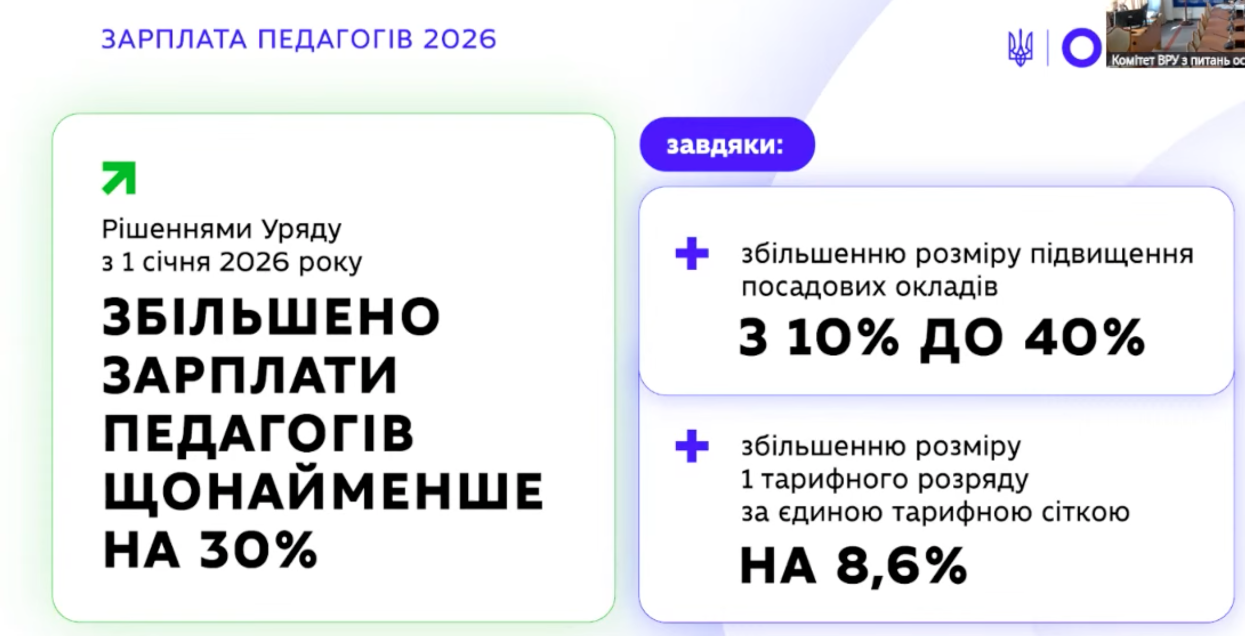 Сьогодні відбулось засідання Комітету Верховної Ради України з питань освіти, науки та інновацій на якому мова йшла про результати моніторингу оплати праці педагогічних працівників закладів загальної середньої освіти, у тому числі у розрізі видів та розмірів виплачених надбавок і доплат, профінансованих за рахунок коштів місцевих бюджетів, за результатами виплати заробітної плати за січень 2026 року, збільшеної на 30%.
