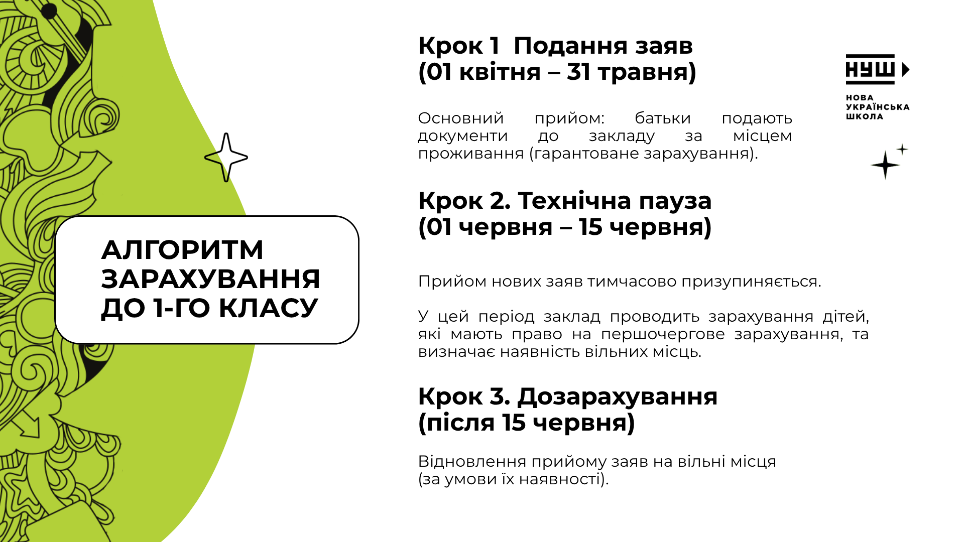 Прийом заяв з 1 квітня до 31 травня включно: батьки мають право подати заяву до закладу за місцем проживання (територія обслуговування) та до будь-якої іншої кількості шкіл на вільні місця.