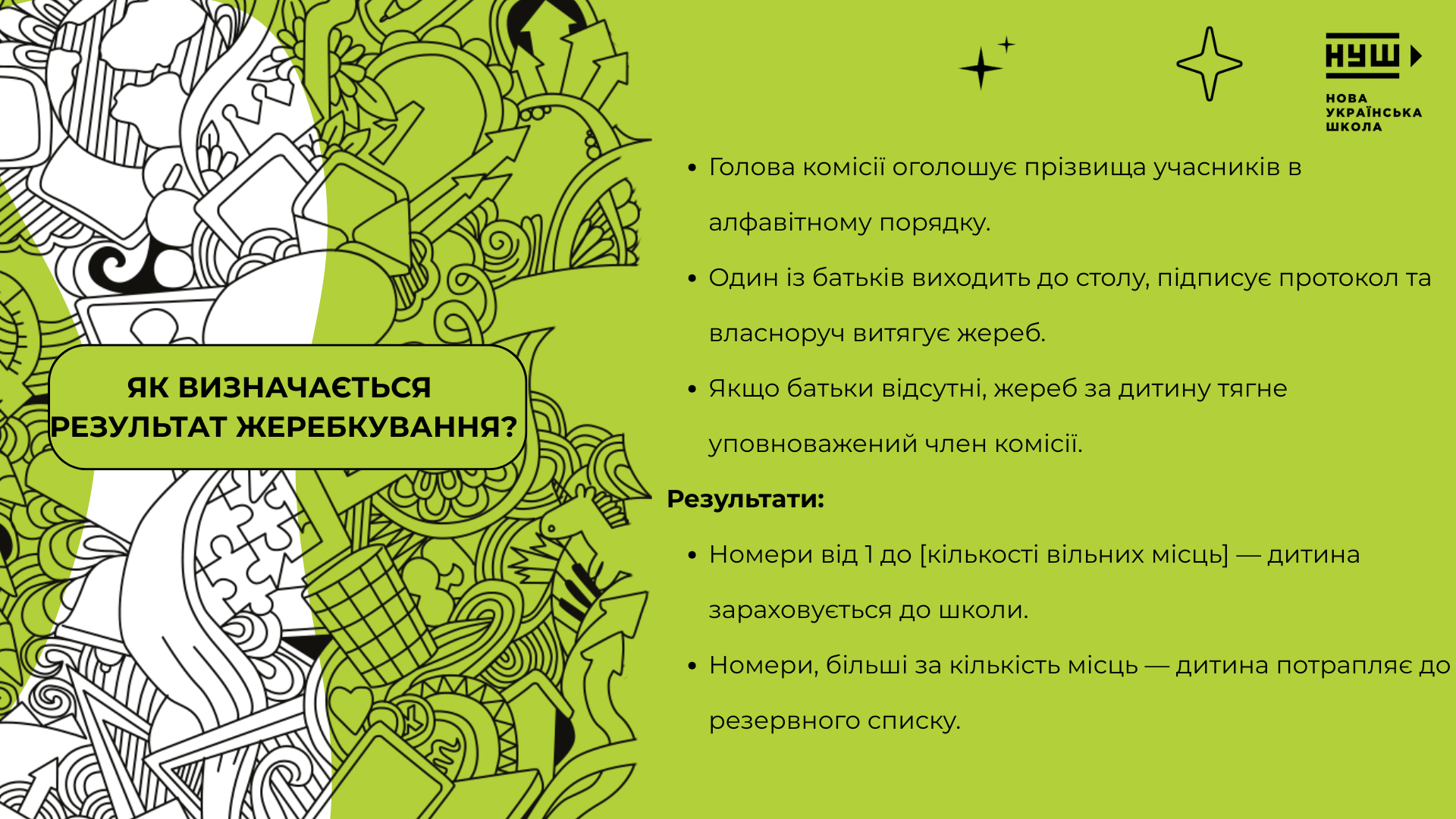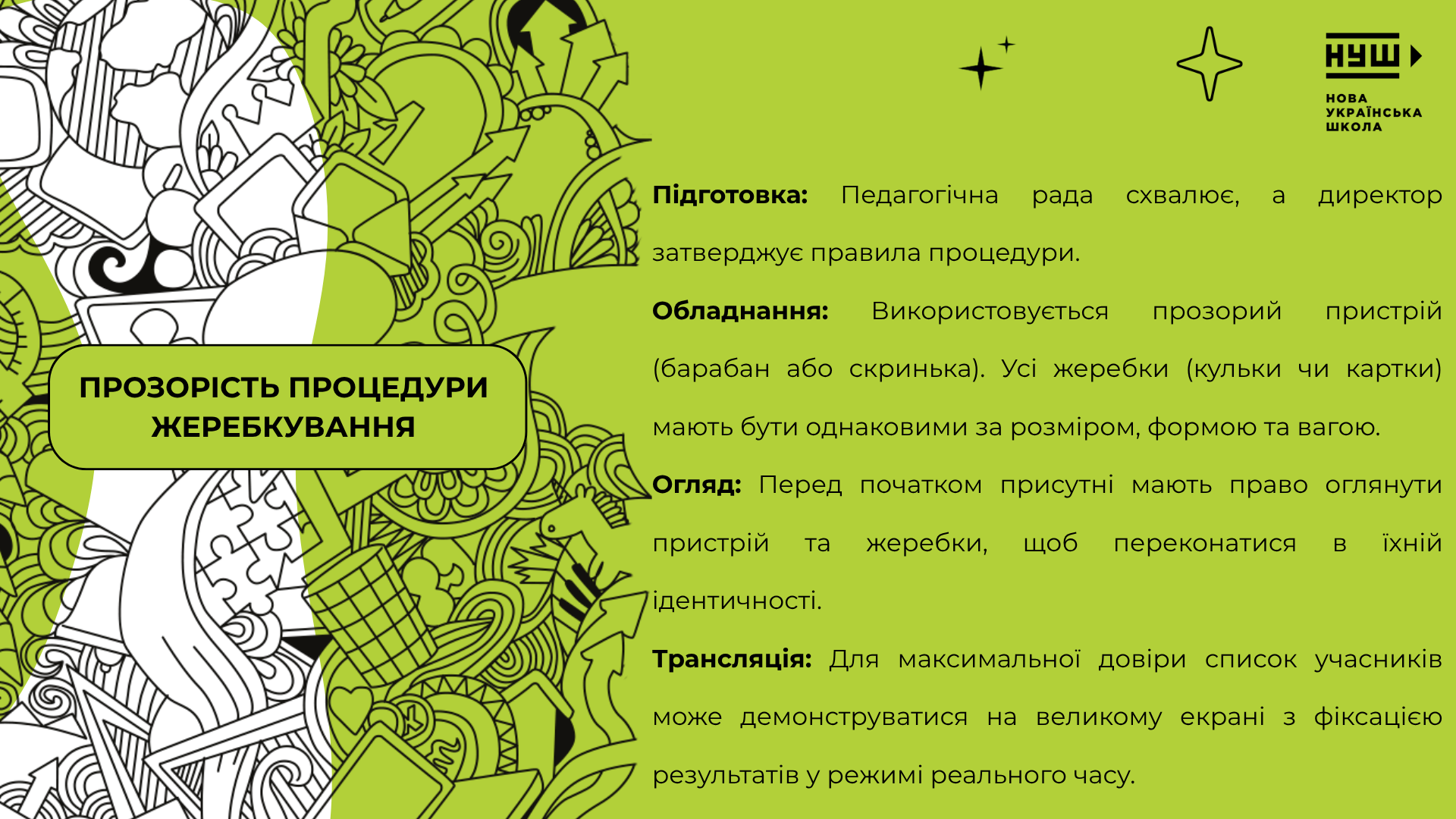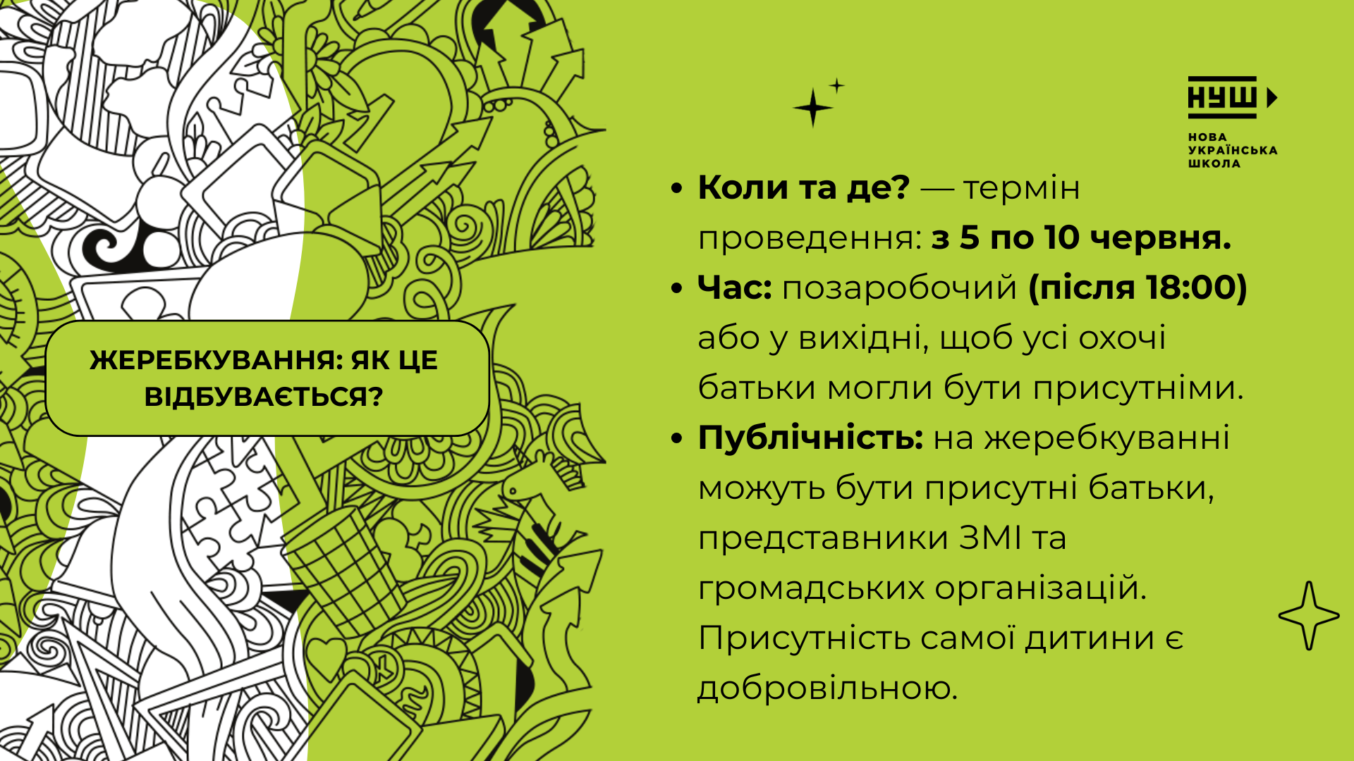 Процес: жеребки дістають у порядку алфавітного списку дітей. Якщо батьків немає, жеребок тягне член комісії.