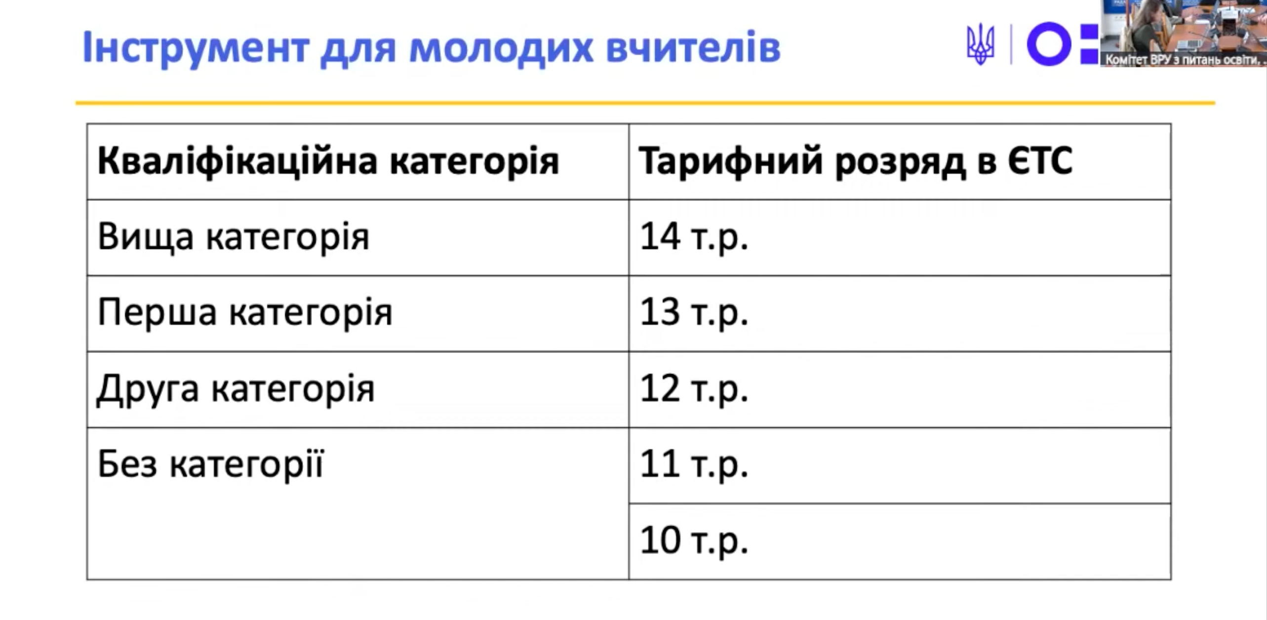 Щодо напрацьованих пропозицій МОН Анастасія Софієнко акцентувала на інструментарії, який був використаний для формування моделі оплати праці молодих вчителів: “Зараз існує 4 кваліфікаційні категорії вчителів, але при цьому на 4 кваліфікаційні категорії задіяні 5 тарифних розрядів. Тож наймолодший вчитель, який не має категорії, може отримати тарифний розряд і 10, і 11. Пропонується прибрати 10 розряд, щоб запропонувати більшу зарплату для молодого вчителя. Розглядається варіант відповідності 4 посадових окладів 4 кваліфікаційним категоріям, а не 5. Також пропонується вмонтовати надбавку за престижність та за несприятливі умови в посадовий оклад”.