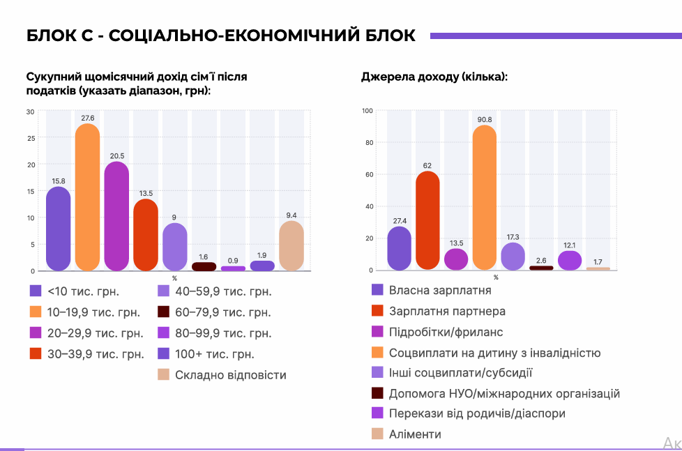 Частина опитаних працює повний або неповний робочий день офіційно; інші задіяні у фрілансі чи неформальному секторі; значна частина перебуває в активному пошуку роботи.
