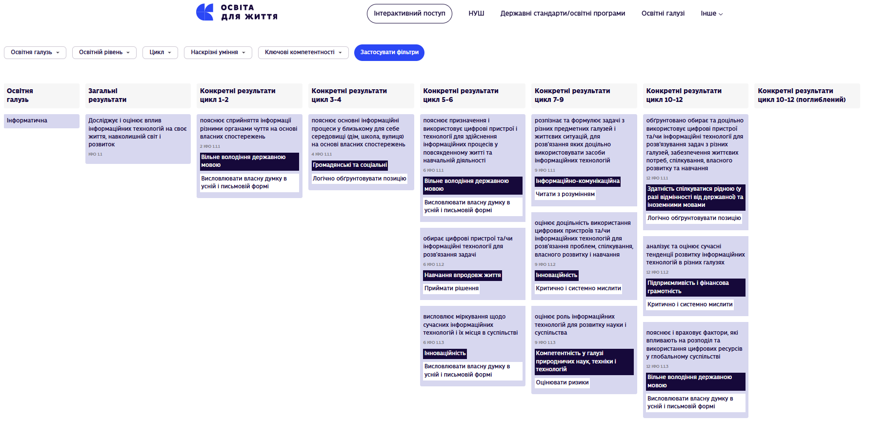 Серцем платформи є вкладка “Інтерактивний поступ”. Уявіть, що у вас у руках “пульт керування”. Ви можете обрати будь-яку освітню галузь, рівень (від 1 до 12 класу), конкретний цикл навчання, наскрізні вміння та ключові компетентності.