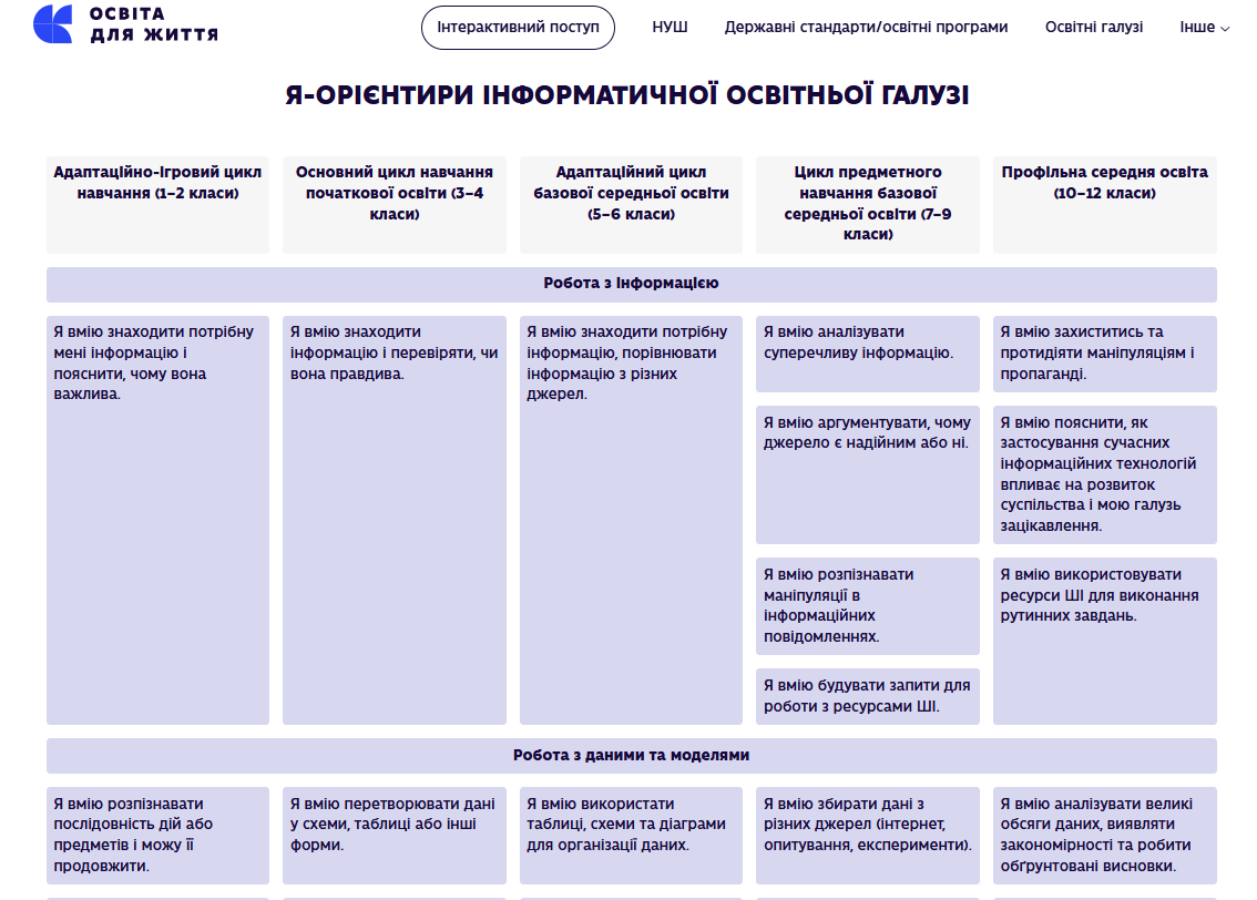 А в профільній школі (10–12 класи) ми бачимо результат, необхідний сучасній людині: “Я вмію захиститися від маніпуляцій і пропаганди” та навіть “Я вмію використовувати ресурси ШІ для виконання рутинних завдань”.