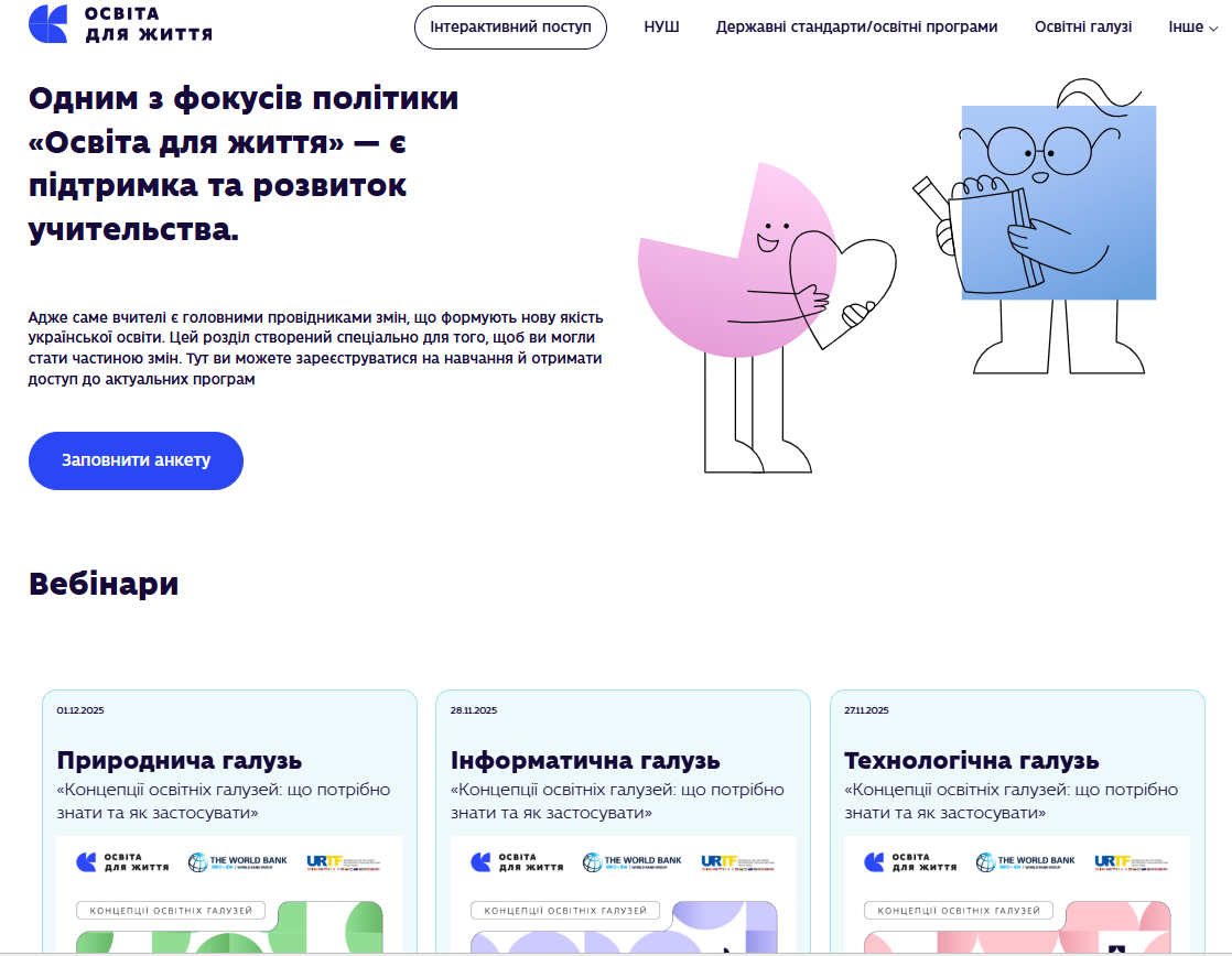 Платформа “Освіта для життя” вас приємно здивує. Це справжній інтерактивний конструктор, де все розкладено “по поличках”: від Державних стандартів та освітніх програм до готових вебінарів і партнерських кейсів.