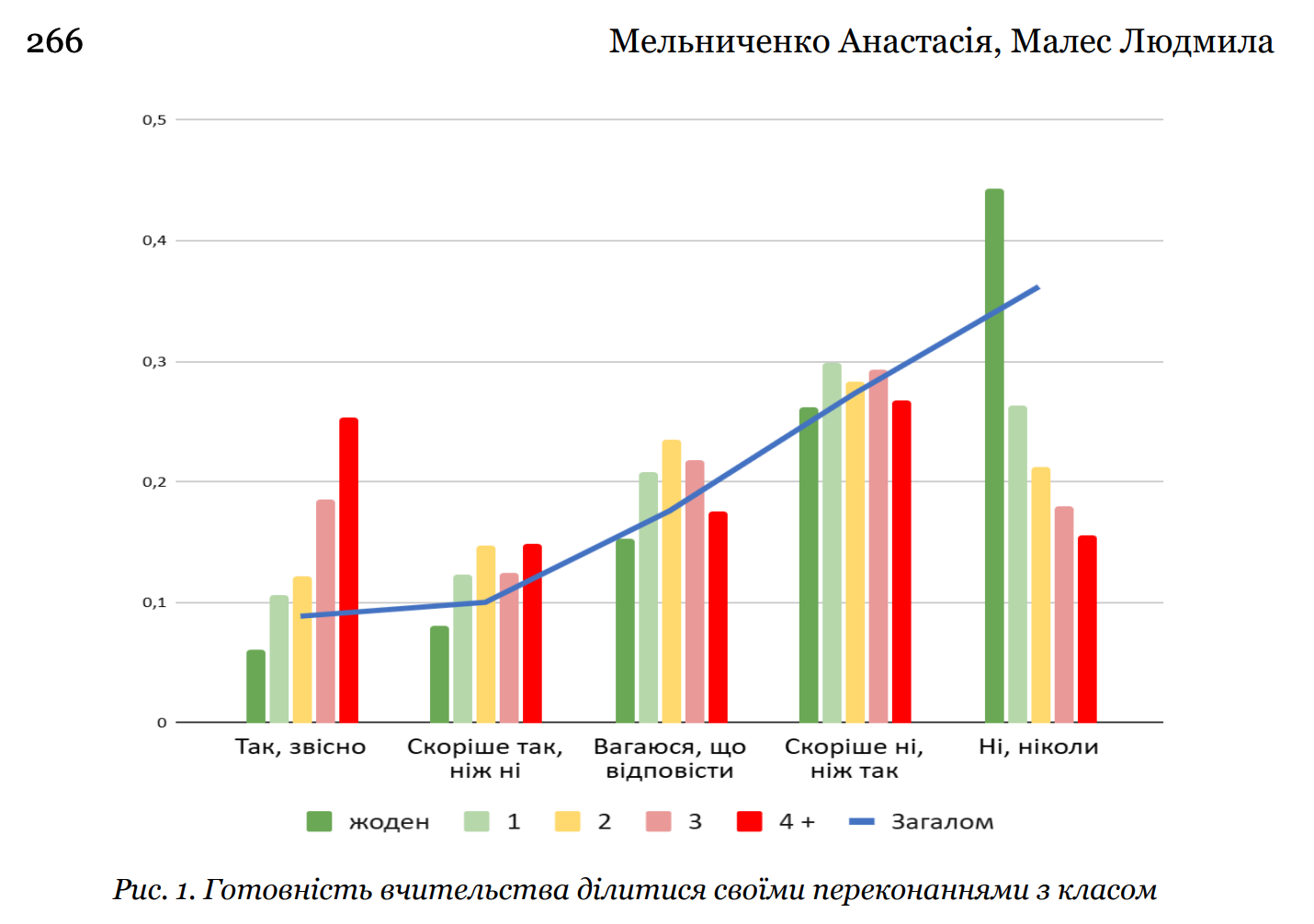 На рисунку ви можете бачити звʼязок між кількістю підтриманих наративів розбрату (від жодного до 4+) і відповіддю на питання, чи готові вчителі ділитися своїми переконаннями з класом.